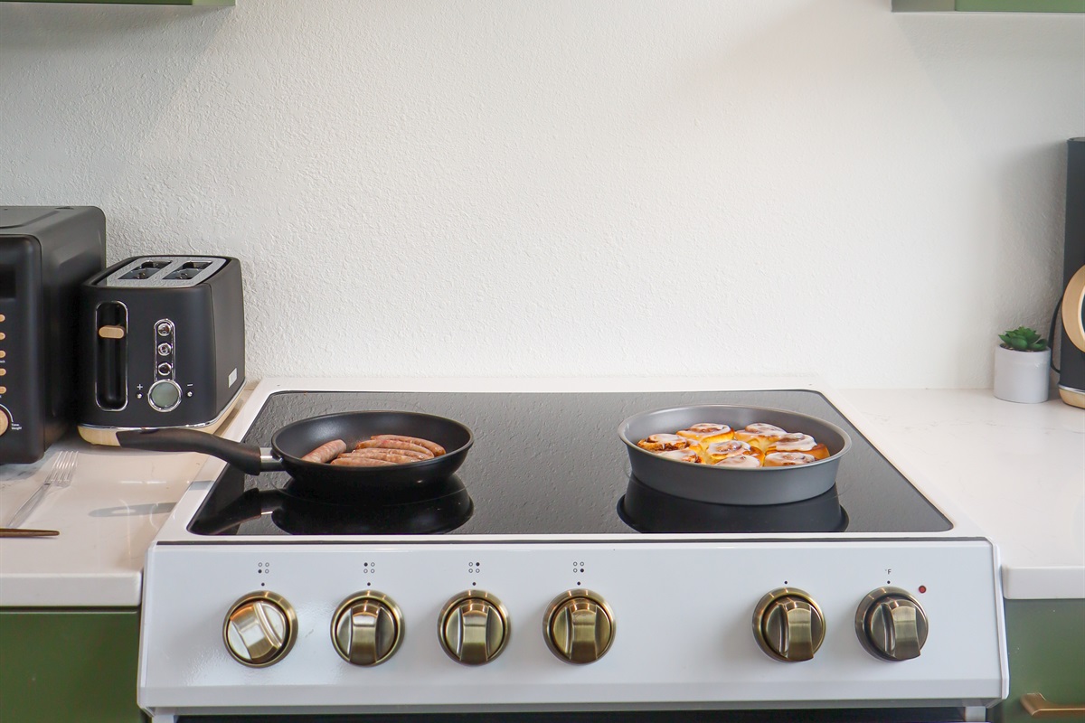 Fully stocked with high-end appliances, cookware, and everything needed for home-cooked meals. The open layout connects seamlessly to the dining area for group meals and social cooking.